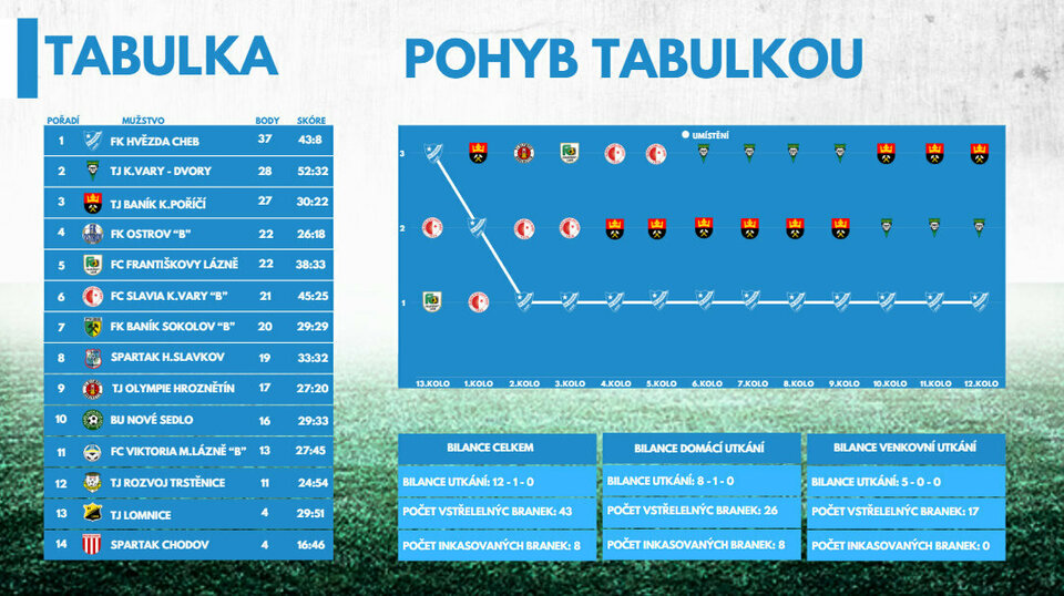 Po podzimní části vévodíme tabulce 5. ligy Karlovarského kraje se ziskem 37 bodů a s bilancí třinácti vítězství a jedné remízy. Hvězda tak zůstává i přes zimní fotbalovou přestávku jediným týmem soutěže, který ještě nepoznal hořkost porážky a může se pyšnit nejlepší obranou celé soutěže. Ve třinácti duelech jsme inkasovali pouze osm branek a to v pěti zápasech. Co se týká útočné fáze, tak se 43 nastřílenými brankami se jedná o třetí nejlepším celek soutěže. Nejvíce branek v letošním ročníku zatím nastříleli karlovarští Buldoci, kteří se prosadili 52x a na druhém místě se s pětačtyřiceti přesnými zásahy nachází FC Slavia Karlovy Vary „B“. Na 1. místo se Hvězda dostala ve třetím kole a vedoucí pozici již neopustila. Hvězdě se více dařilo na venkovní půdě. V pěti venkovních zápasech fotbalisté Chebu pětkrát zvítězili, neinkasovali ani jednu branku a vstřelili sedmnáct branek.